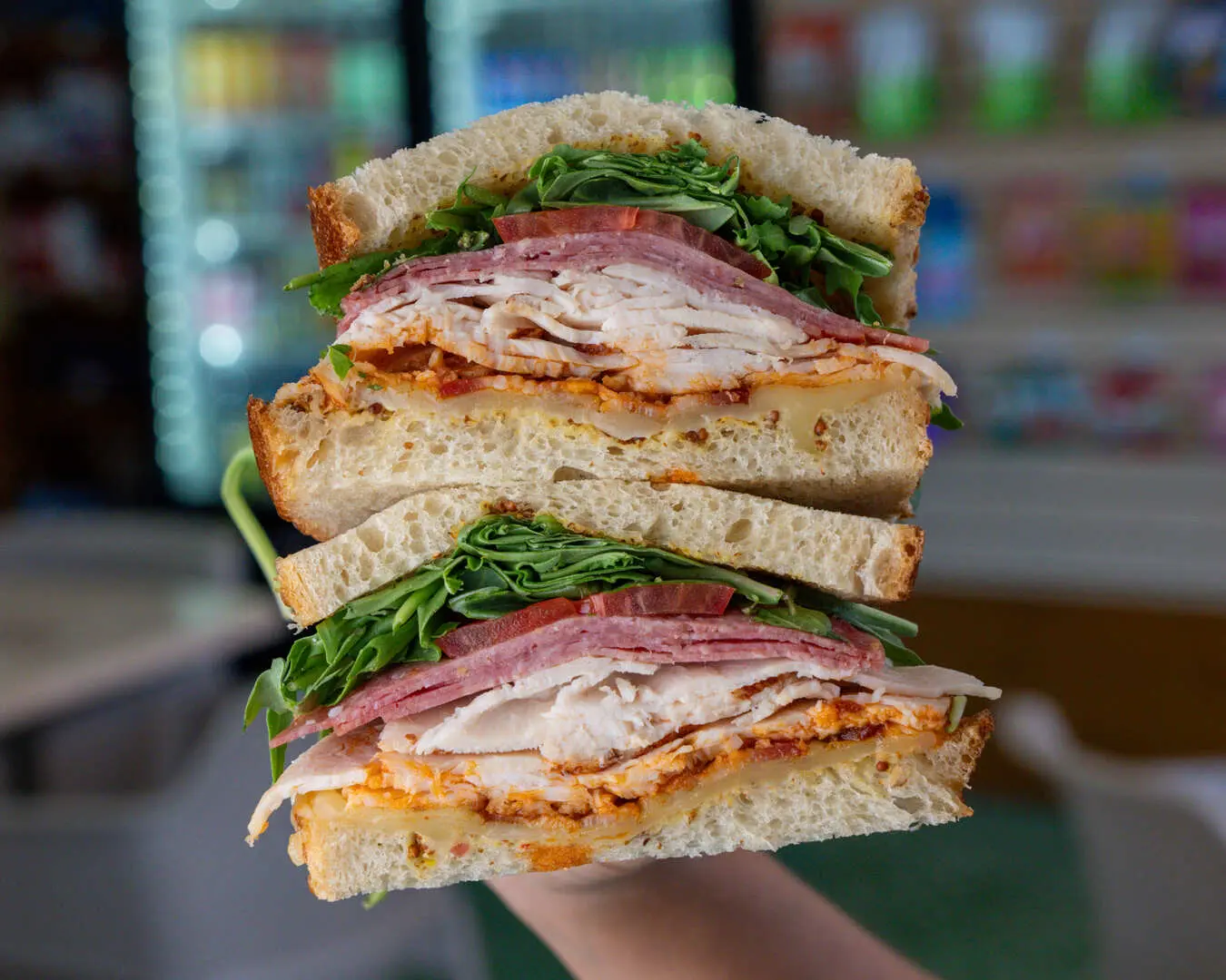 Pan Sourdough artesanal, pechuga de pollo deli, salami genoa, queso fontina, pesto rojo, tocino, arugula orgánica, tomate, mostaza antigua.