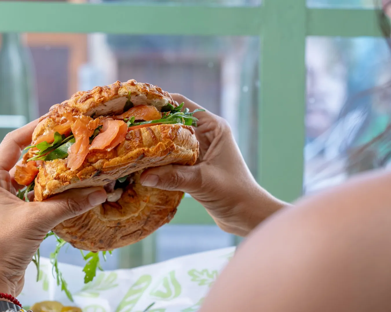 Pan Croissant, jamón black forest, burrata, gouda ahumado, tomate, mix lechuga, mayo pesto.