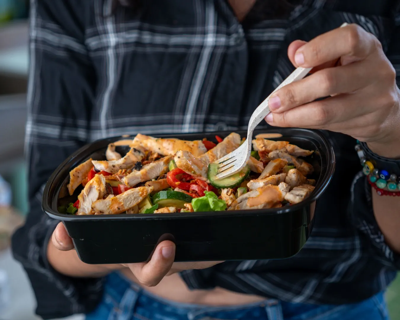 Pollo orgánico, mix de lechugas orgánicas, tocino, elote amarillo, aguacate, pimientos, pepino persa, tomate cherry, frijol negro, aderezo ranch chipotle.